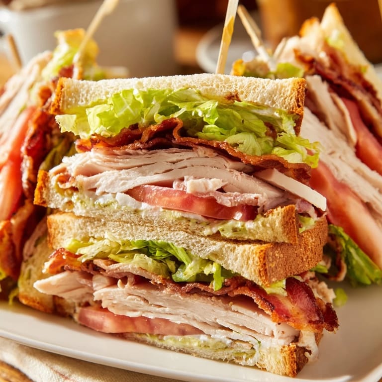Save to Pinterest The kitchen counter was covered in Sunday newspaper sections when my dad decided we needed club sandwiches for lunch. He pulled out three slices of bread per person like he was revealing a magic trick, explaining that the triple decker was non-negotiable. I watched him carefully assemble each layer with the precision of someone building something important. Now every time I make these towering creations, I can practically smell bacon frying and hear the crunch of that first impossible bite through three layers of toast.